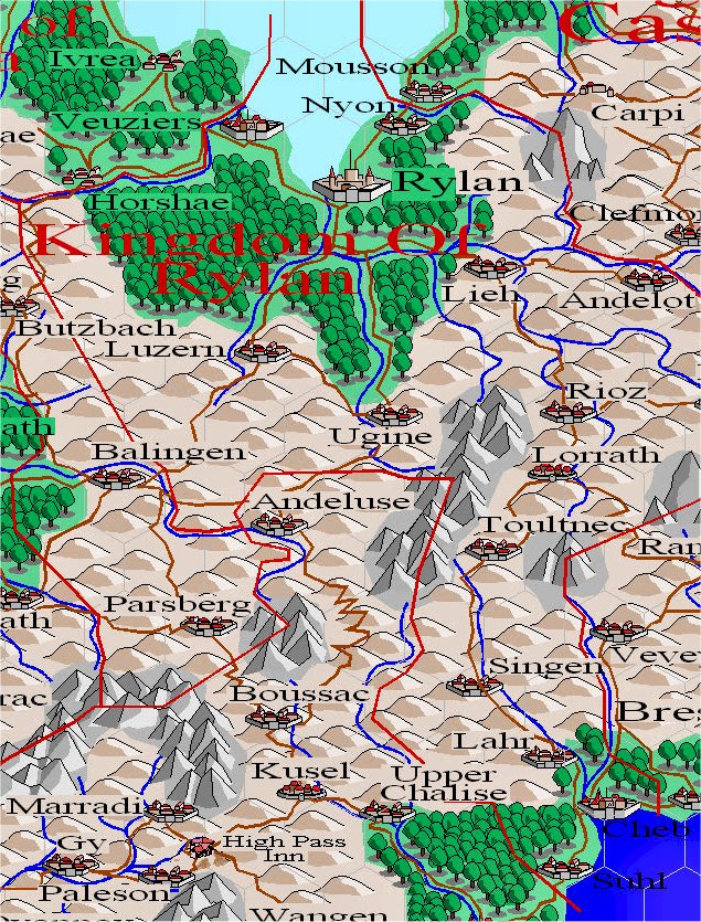 Ruled by the Evil King Saldoc Ragnol, Rylan has become a Powerful and Despotic Kingdom which is constantly trying to expand it's borders, seems to be constantly warring with at least 1 of it nieghboughs at any given time. In recent times Rylan conquered the Duchy of Cheb from the Kingdom of Relmandia, which now makes it the only country with a seaboard on the Inner and Outer Seas.